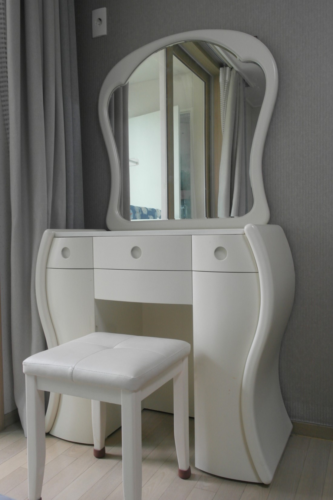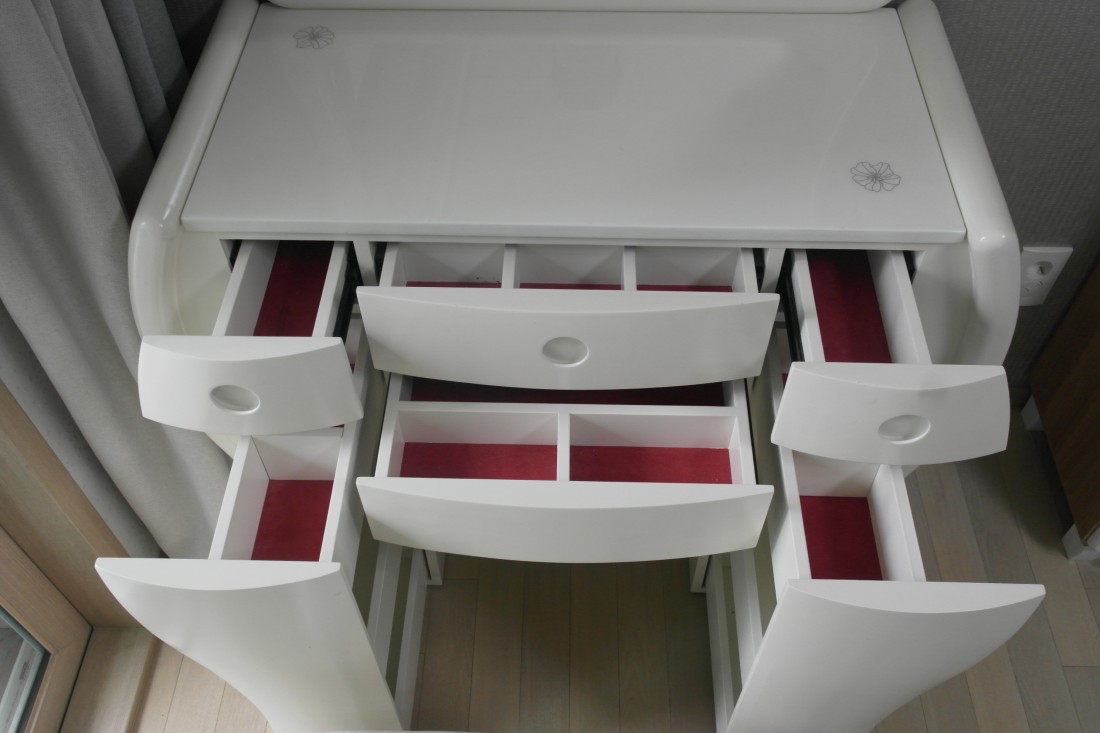 흰색 화장대 팝니다. 상판 대리석이고 수납공간 많습니다. 스툴 포함입니다.