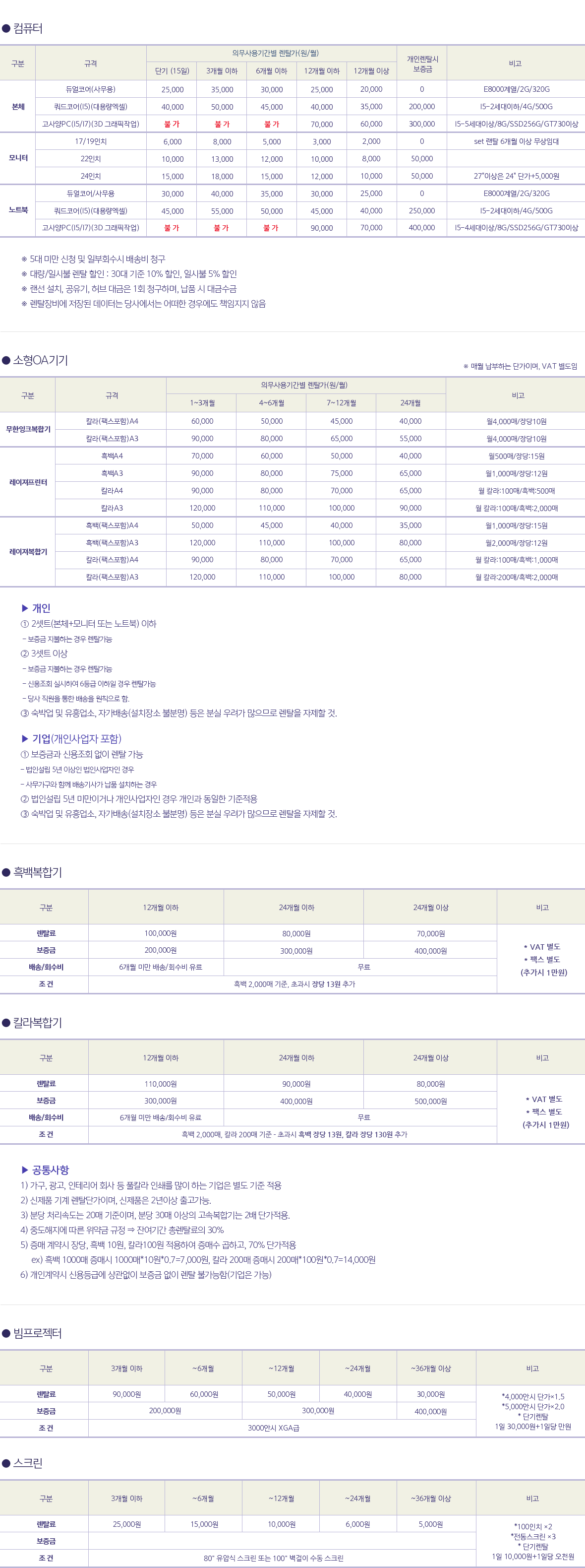 HOME > 판매·렌탈·매입안내 > OA기기 > 월렌탈단가표